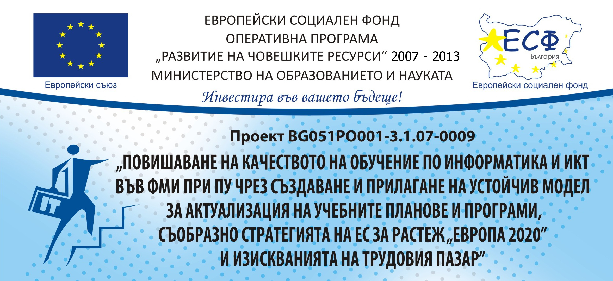"Тази интернет страница е изготвена с финансовата подкрепа на Оперативна програма "Развитие на човешките ресурси", съфинансирана от Европейския социален фонд на Европейския съюз. Пловдивският университет "Паисий Хилендарски" носи цялата отговорност за съдържанието на уебстраницата, което при никакви обстоятелства не може да се приеме като официална позиция на Европейския съюз или Министерство на образованието и науката. Схема BG051PO001-3.1.07 "Актуализиране на учебните програми във висшето образование в съответствие с изискванията на пазара на труда." |
