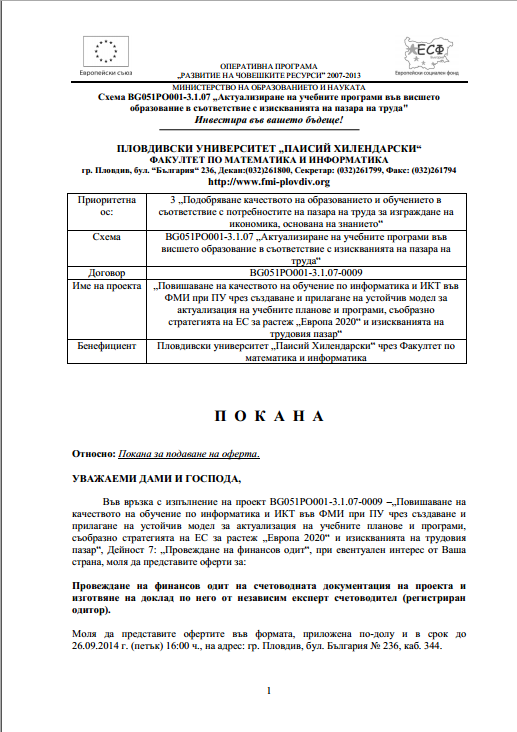 Факултет по математика и информатика - Покана за оферта 16.09.2014
