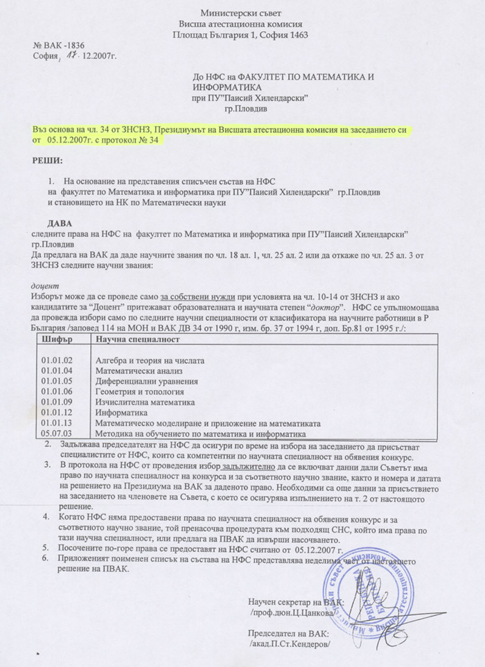 Факултет по математика и информатика - решение на ВАК
